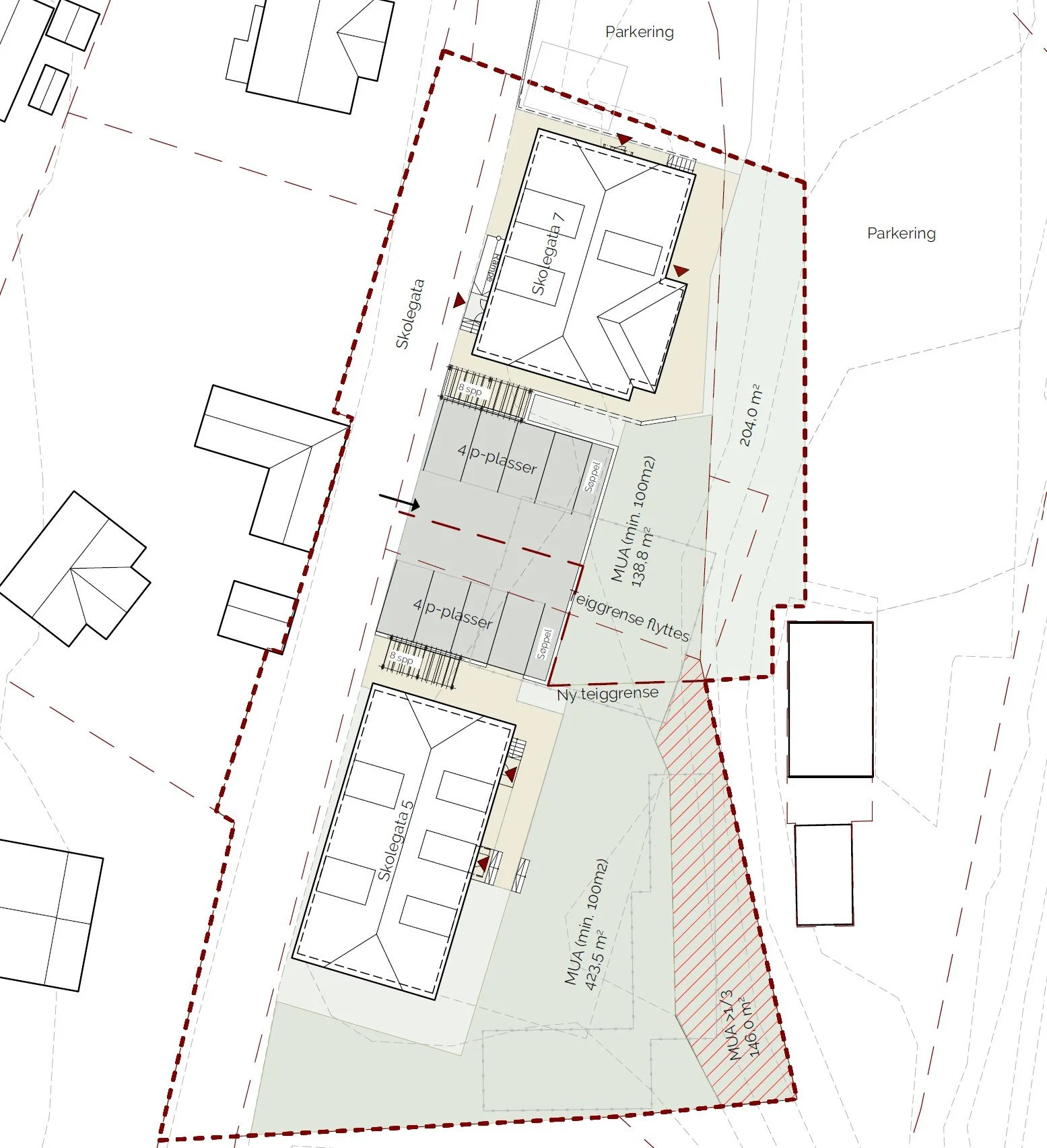 Bevaringsverdig garasjebygg foreslås også revet for å tilfredsstille krav til MUA og parkering. Adkomst er lagt fra Skolegata, mellom bebyggelsen, og parkeringsdekningen satt til en biloppstillingsplass per bolig.